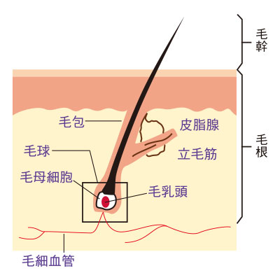 毛根内分には髪の毛をつくる「毛球」と呼ばれる部位があり、その内側にある「毛乳頭」が、毛細血管から髪の原料となる栄養を取り込んで「毛母細胞」へと送り込みます。栄養を得た毛母細胞は細胞分裂を繰り返し、髪をどんどん成長させていきます。しかし、その細胞分裂には十分な栄養が必要なため、毛細血管からの栄養が不足すると、毛髪の成長が滞り、これが脱毛や薄毛の原因になると考えられています。