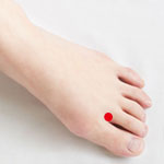 足の親指の付け根にある関節の指先寄りで、足の人指し指側の少しへこんだところ。