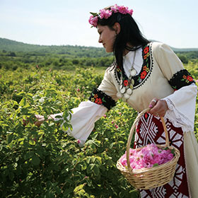 バラの収穫は、毎年5月中旬から6月上旬にかけての約20日間に行われます。この時季には、1年かけて大切に育てたバラの収穫を祝って、バラの谷ではバラ祭りが開かれます。ブルガリアでもっとも有名な祭りといわれており、民族衣装を身につけた老若男女が集まり、ローズクイーンを選ぶコンテストやパレードなどが行われ、収穫の喜びを楽しみます。今では多くの観光客も訪れにぎわいます。